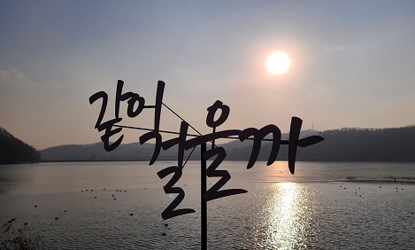위 수리산 둘레길 트레킹을 끝내고 마을버스를 타고 내려 오다 보면 반월호수가 있습니다. 이 반월호수의 저녁노을이 군포의 3 경이라고 하는데 산으로 둘러싸인 지형으로 호수에 지는 산그림자와 저녁나절의 노을, 이른 아침의 물안개가 아름다운 곳으로 호수 주변에는 예쁜 카페들과 좋은 글귀들을 써놓은 게 눈에 들어와서 하나하나 찍어 보았습니다.