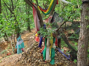 여기부터는 조금 오르막이 있긴 했지만 이후에는 완만한 경사의 걷기 좋은 길이었습니다. 걷는 중 동네주민으로 보이는 분 2~3명을 제외하고는 마주치는 사람이 없을 정도로 한적한 곳이었는데 중간에 형형 색상의 천으로 둘러싸인 성황당도 보였습니다.
