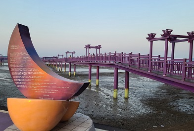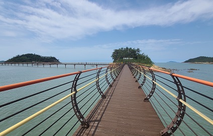 이어서 차를 타고 무한의 다리로 이동했는데 이곳은 무한대를 의미하는 8월 8일 섬의 날을 기념하고, 섬과 섬이 다리로 연결되는 연속성과 끝없는 발전의 의미를 담은 것으로 이곳은 무한대의 사랑을 고백하는 장소로 커플들에게 인기가 높다고 합니다. 우리가 갔을 때는 날씨도 좋고, 물이 차 있었는데 해변의 조형물과 구리도와 할미도를 연결한 다리가 멋진 조화를 이루고 있어 사진 찍기에도 참으로 좋은 곳입니다. 이렇게 자은도의 아름다운 곳을 보는 걸로 하루를 마감했습니다.