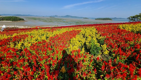 주차장은 제법 컸는데도 차가 꽉 차 있었지만 주변 도로가에도 주차가 가능해서 큰 불편은 없었습니다. 배로 25분 정도 이동해 도착한 병풍도는 축제를 알리는 현수막이 곳곳에 붙어 있었는데 맨드라미가 잇는 길을 따라 언덕을 올라기니 여기는 마을 지붕까지 맨드라미와 같은 붉은색으로 예쁘게 되어 있었습니다. 병풍도는 원래 염전과 논농사 그리고 새우와 김양식이 주업이었는데 예전에 약효가 뛰어난 소금을 얻기 위해 소금밭 주면에 맨드라미를 많이 심었고, 그래서 병풍도에서는 맨드라미를 흔히 볼 수 있었는데 섬인구가 줄면서 농지가 황폐해지면서 이를 활용할 방법으로 신안군과 주민이 합심하여 세계에서 가장 큰 맨드라미공원을 조성하였다고 합니다. 맨드라미 공원에는 예쁜 사진을 남길 수 있도록 포토존도 많이 만들어 두었는데 개인적으로 저는 예쁘게 꾸민 공중전화 부스가 제일 좋았고. 정상에 있는 예쁜 화장실도 기억에 남습니다.
