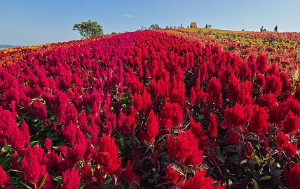 주차장은 제법 컸는데도 차가 꽉 차 있었지만 주변 도로가에도 주차가 가능해서 큰 불편은 없었습니다. 배로 25분 정도 이동해 도착한 병풍도는 축제를 알리는 현수막이 곳곳에 붙어 있었는데 맨드라미가 잇는 길을 따라 언덕을 올라기니 여기는 마을 지붕까지 맨드라미와 같은 붉은색으로 예쁘게 되어 있었습니다. 병풍도는 원래 염전과 논농사 그리고 새우와 김양식이 주업이었는데 예전에 약효가 뛰어난 소금을 얻기 위해 소금밭 주면에 맨드라미를 많이 심었고, 그래서 병풍도에서는 맨드라미를 흔히 볼 수 있었는데 섬인구가 줄면서 농지가 황폐해지면서 이를 활용할 방법으로 신안군과 주민이 합심하여 세계에서 가장 큰 맨드라미공원을 조성하였다고 합니다. 맨드라미 공원에는 예쁜 사진을 남길 수 있도록 포토존도 많이 만들어 두었는데 개인적으로 저는 예쁘게 꾸민 공중전화 부스가 제일 좋았고. 정상에 있는 예쁜 화장실도 기억에 남습니다.