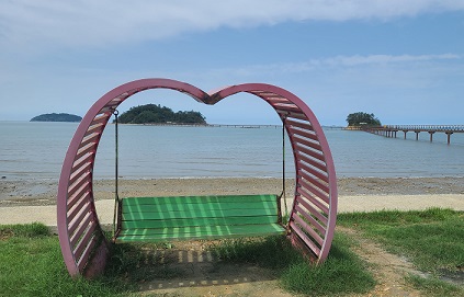 이어서 차를 타고 무한의 다리로 이동했는데 이곳은 무한대를 의미하는 8월 8일 섬의 날을 기념하고, 섬과 섬이 다리로 연결되는 연속성과 끝없는 발전의 의미를 담은 것으로 이곳은 무한대의 사랑을 고백하는 장소로 커플들에게 인기가 높다고 합니다. 우리가 갔을 때는 날씨도 좋고, 물이 차 있었는데 해변의 조형물과 구리도와 할미도를 연결한 다리가 멋진 조화를 이루고 있어 사진 찍기에도 참으로 좋은 곳입니다. 이렇게 자은도의 아름다운 곳을 보는 걸로 하루를 마감했습니다.