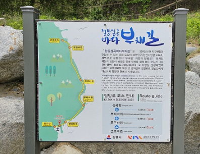 부채길은 총길이 2.86km로 편도 약 70분정도 소요되는데 몇 가지 주의할 점을 말씀드린다면 첫째 일부러 힘든 길을 선택하는 게 아니라면 꼭 정동에서 출발, 심곡 도착으로 하셔야 합니다. 심곡에서 출발하시면 바닷길이 끝나는 시점부터 경사가 심한 데크길로 산 하나를 올라가야 정동출입구가 나오기 때문입니다.