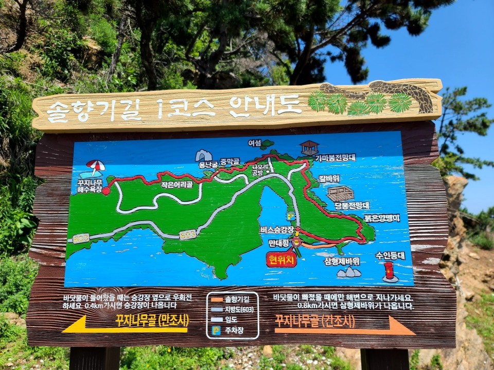 출발점으로 다시 돌아오는 원점회귀가 아니라 운전할 한 명이 어느 정도 걷다가 다시 돌아와 차를 가지고 도착점인 꾸지나무골해수욕장으로 오기로 했습니다. 횟집들을 지나 직진하자 솔향기길 1코스 안내도가 나왔는데 처음부터 끝까지 대부분이 바다를 옆에 두고 걷는 길이었습니다. 우리가 도착한 시점은 다행히 바닷물이 빠진 썰물시간이라 다행히 우회하지 않고 바로 데크길을 걷다가 바닷가로 내려와서 멀리 삼 형제바위를 보았는데 굴을 따러 간 어머니를 기다리다가 모두 바위가 되었다는 슬픈 전설이 있습니다.