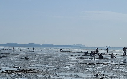 조개를 잡기 위해서는 해당지역의 물때표를 먼저 봐야 하는데 인터넷 검색 또는 바다타임 같은 앱을 사용해서 간조시간을 확인해야 합니다. 이 간조시간은 물이 가장 많이 빠졌을 때의 시간으로 이 시간 이후부터는 바닷물이 육지 쪽으로 들어오게 되는데 조개 잡기는 통상 간조시간 전후 2시간씩 총 4시간에 하시는 게 좋습니다.