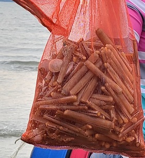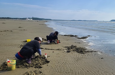 그냥 잡아당기시면 아래가 잘려서 나오기 쉽습니다. 맛조개 외에도 동죽이 더 많고, 가끔씩은 담뱃갑 만한 큰 백합도 볼 수 있는데 저는 달산포와 청포대 중간쯤에서 주로 잡으며, 간조시간 이후 물이 들어올 때 더 많이 잡히는데 그 이유는 정확히 잘 모르겠습니다.